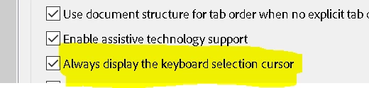 2. Go to Preferences (Ctrl,Cmd+K)>Accessibility>CHECK "Always display the keyboard selection cursor">Click OK