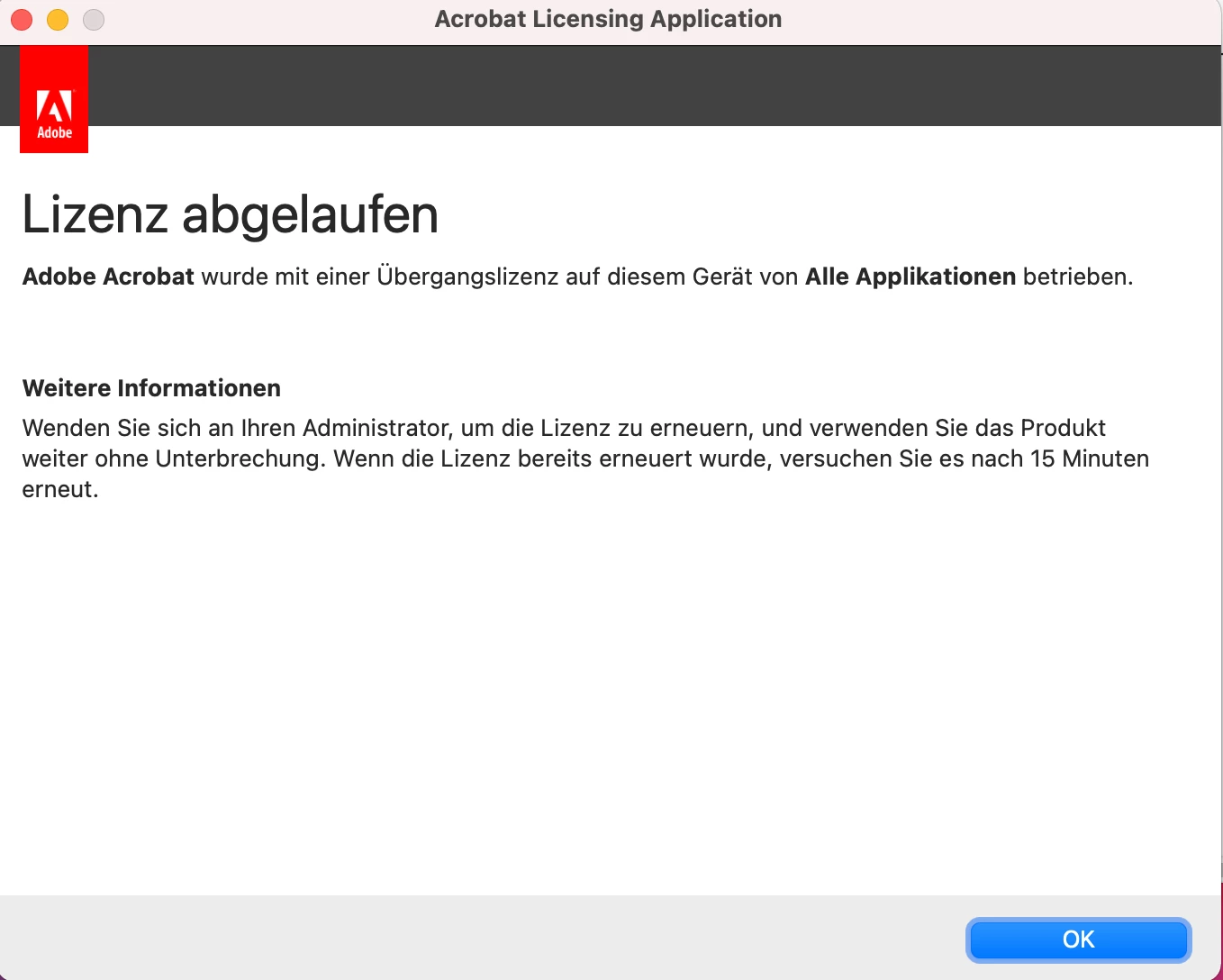 seit geraumer Zeit funktioniert mein Acrobat pdf Reader nicht. Es wird mir immer angezeigt das die Lizenz abgelaufen ist, die anderen Programme funktionieren einwandfrei (InDesign etc.). Ich habe es schon deinstalliert und wieder installiert, leider kein Erfolg.