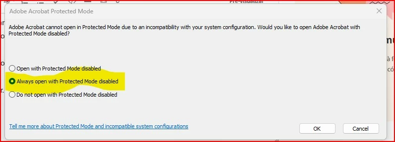 "Adobe Acrobat cannot open in Protected Mode due to an incompatibility with your system configuration".
