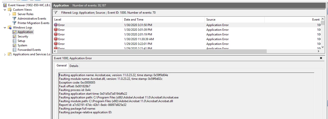 We have one client that has had persistant adobe crashing for years and their providers over time have just eventually shrugged their shoulders and client just lived with constant crashing. We believe it's something environmental as we have fully re-imaged computers and the problem remains for this company. Normally when we see this it is protected mode etc. that makes no difference in this companies case. I have used the acrobat audit tool and also have crash dumps. Current computer base is all win 10 fully up to date, they use ESET for AV. They had similiar problems on their win 7 comps that were decommisioned so this is not new. Any assistance appreciated.