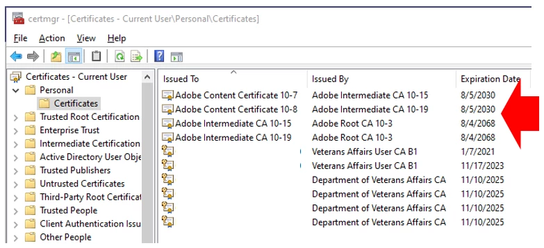 The Adobe certificates are loaded into the Personal/Certificates folder. The SSOi certifcates for PIV log in to the Patient Record System and related products, The Adobe certifcate shows as default forcing the user to have to search for their certificate each time they try to log it. Can Adobe certificates be removed from the Personal/Certificates folder and be placed somewhere else? Due to the expiration date being so far out, there is no way that the Badge expiration will be further out. It appears to default based upon the Certificate with the date further into the future.