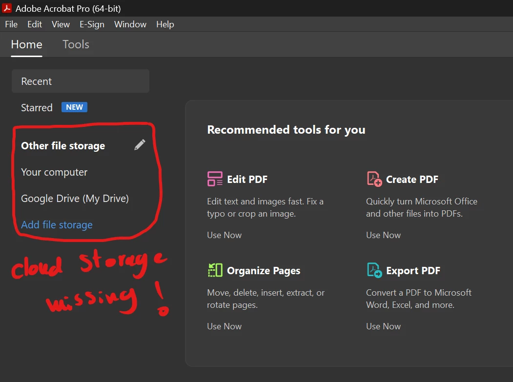 Adobe cloud storage (Previously Document Cloud) is not showing on Adobe Acrobat Pro DC - Windows 11