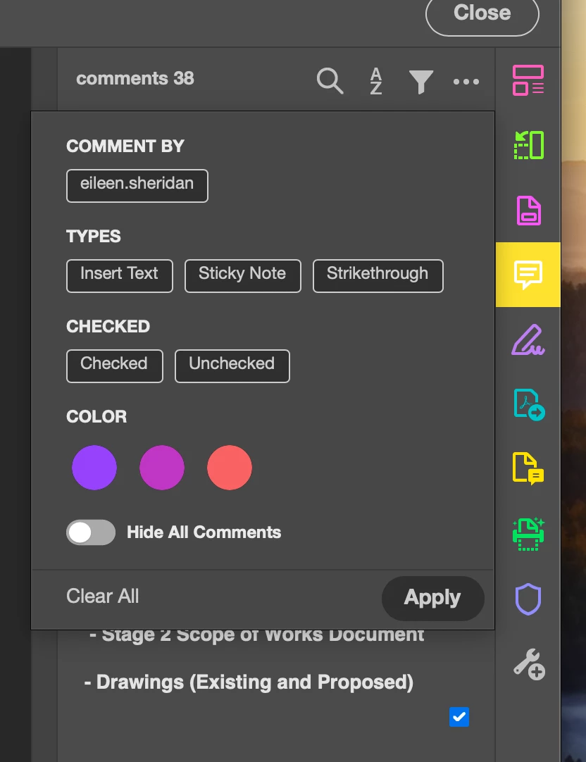 Acrobat Version 2024.002.1005 no longer has the option to filter comments by 'Checked' or 'Unchecked'. Having this option makes completing amends so much easier as the amend is removed from the list once completed. Having them all to view, even the ones which have been ticked is annoying and doesnt help work flow. Is this filter going to be reinsated as its a step back and doesnt improve the app in anyway, being able to filter comments by colour or person isnt that useful but having the option to fully filter whichever way you want should be!