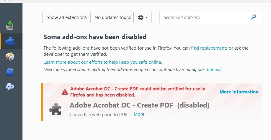 Adobe Acrobat DC - Create PDF could not be verified for use in Firefox and has been disabled.