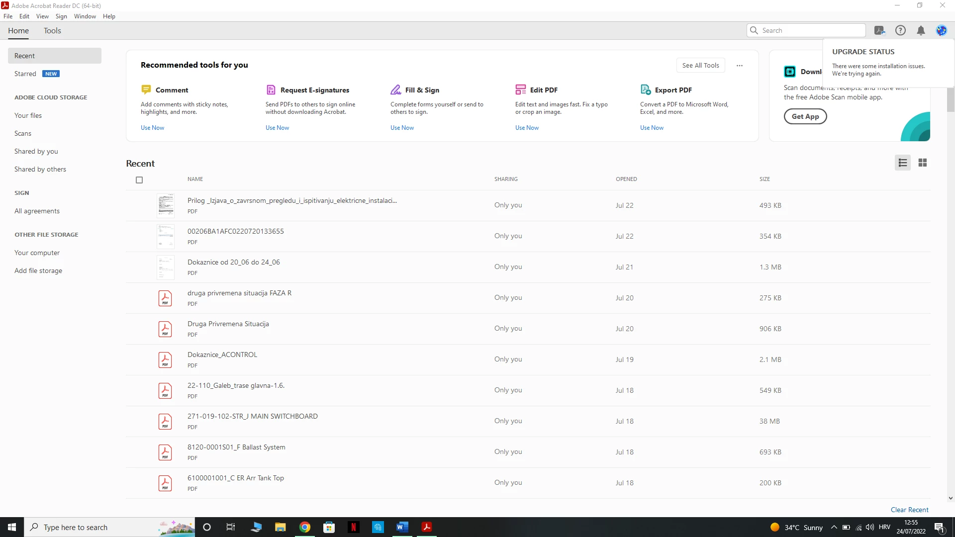 So I have tried to update to pro adobe in order to be able to edit documents. I have been trying for days now and it keep giving me a message with no error code just saying there was installation issue and that they are trying again. like this: