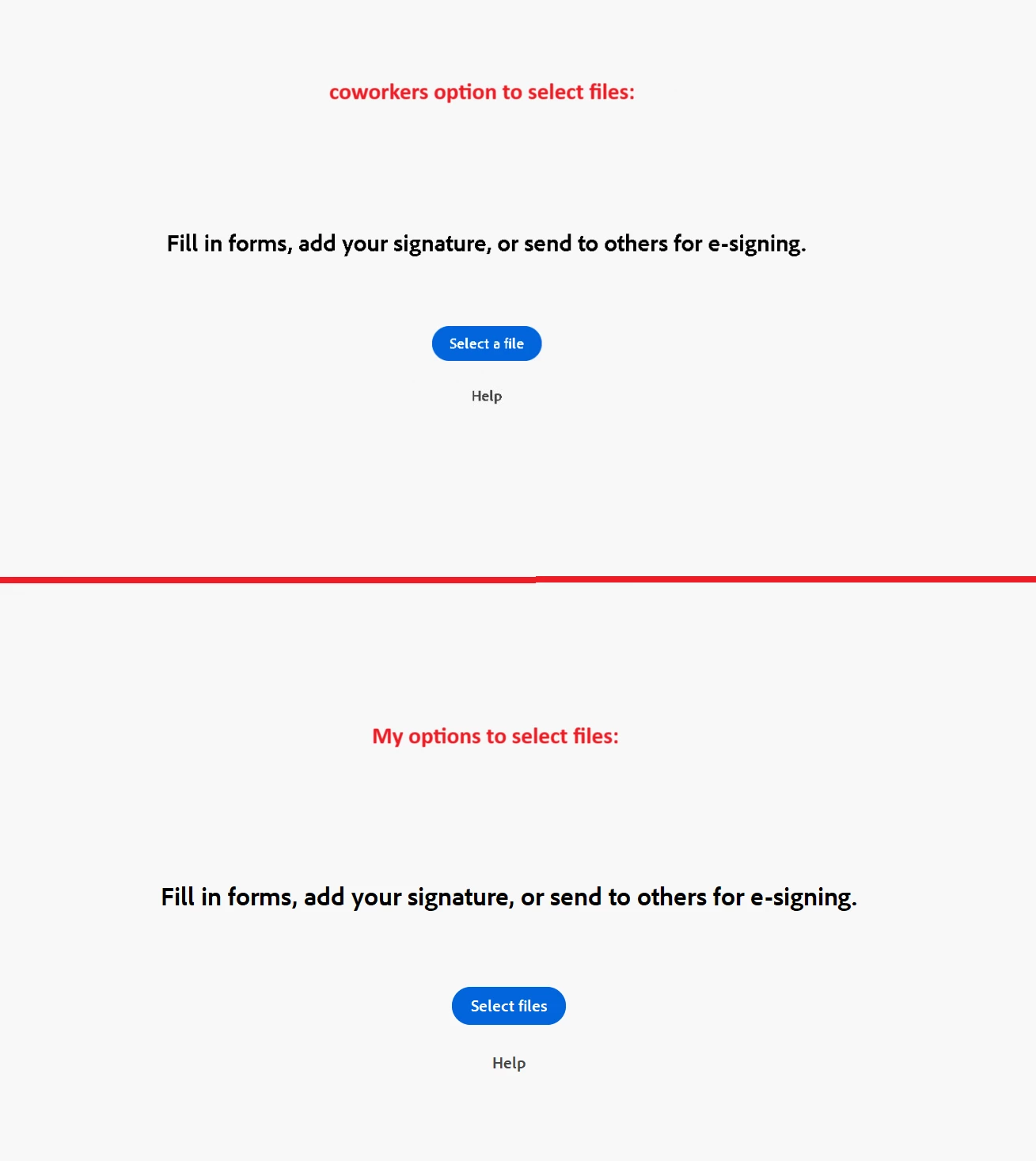 Adobe E-sign: Select a file/Select Files. Help