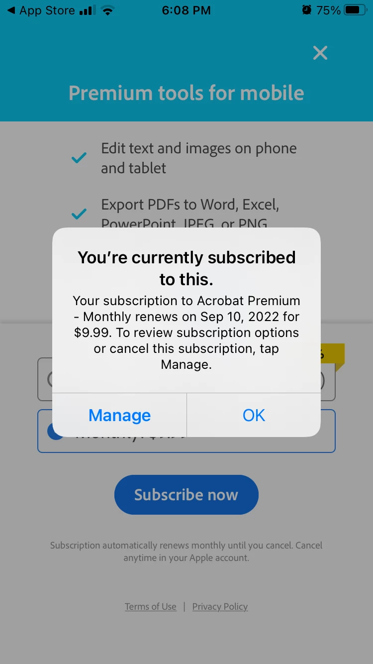 whenever I try to create a pdf the app acts as if I have not subscribed. It gives me the option to subscribe, but when I press that it tells me I am already subscribed (as shown in the screenshot) Then it gives me an unknow error. It is a continuous circle.
