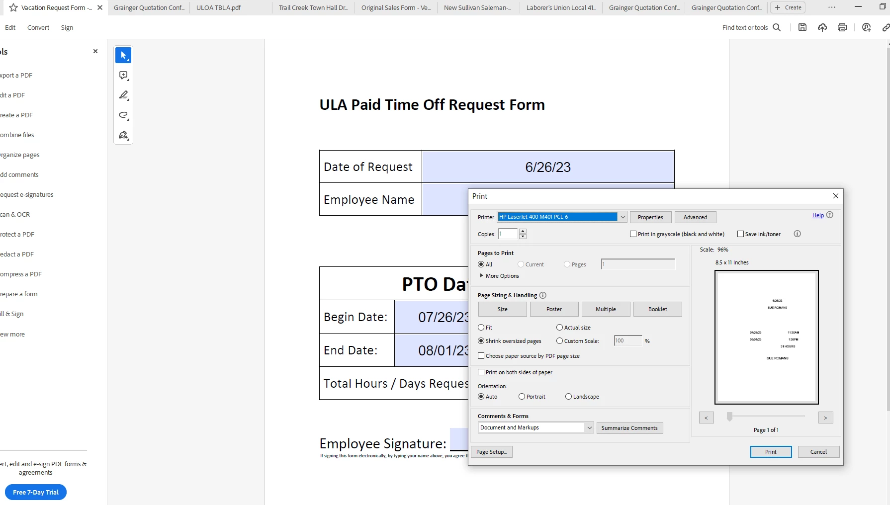 I'm having an issue with printing a PDF from Adobe. The document is perfectly viewable, but when I go to print, it shows up and prints blank, or only the fields that are filled out and none of the actual form. I have attached an image of what I see (some doc info blurred).