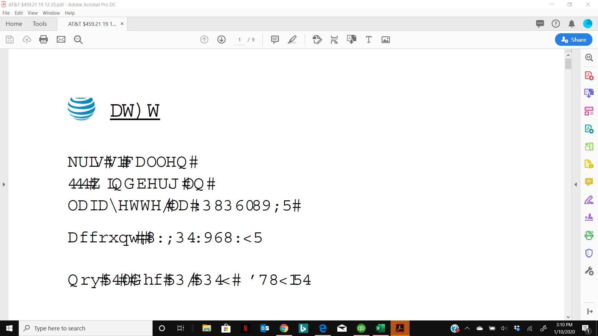 It is just a bunch of symbols.  But it prints find to Microsoft PDF.  This is a recent problem as it has worked fine in the past.  I am not able to trust Adobe to save files correctly and am having to go look at each file to make sure it saved correctly.