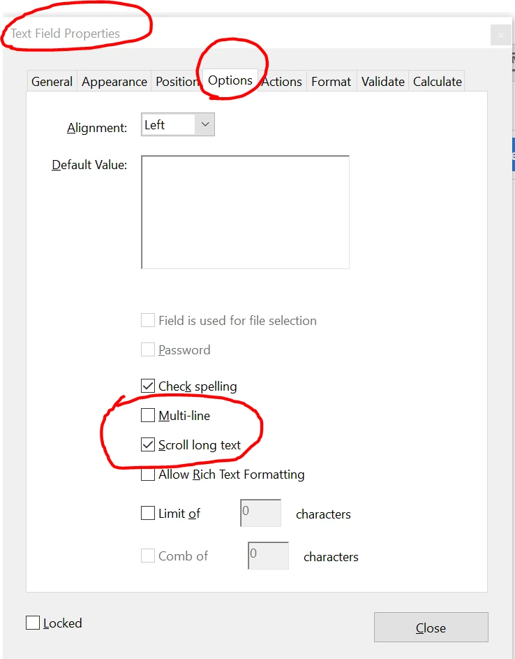 Please open the PDF form > Go to Tools > Prepare form > Double click on the text field to open the text field properties and select 'Multi line' and 'Scroll long text' and see if that works.
