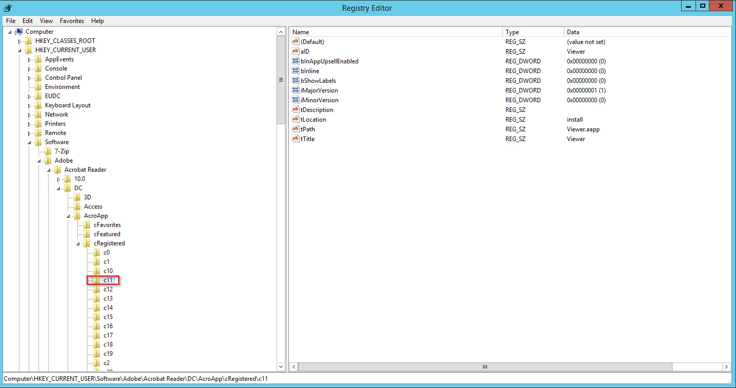 We have identified the issue with a registry key that gets written every time the adobe application has been opened. Location for this key is: HKEY_CURRENT_USER\Software\Adobe\Acrobat Reader\DC\AcroApp\cRegistered\c11