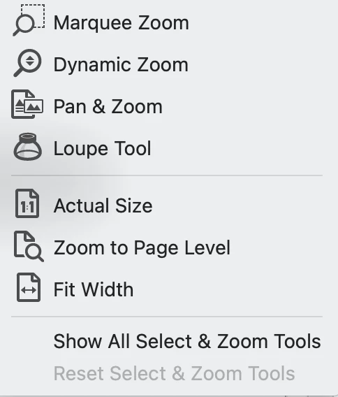 I have read more than a dozen posts here, but the recommended solutions don't show here. When I go to View>Show/Hide>Toolbar Items>Show Select & Zoom Tools, the options for the old icons are not there. Here are my only options:
