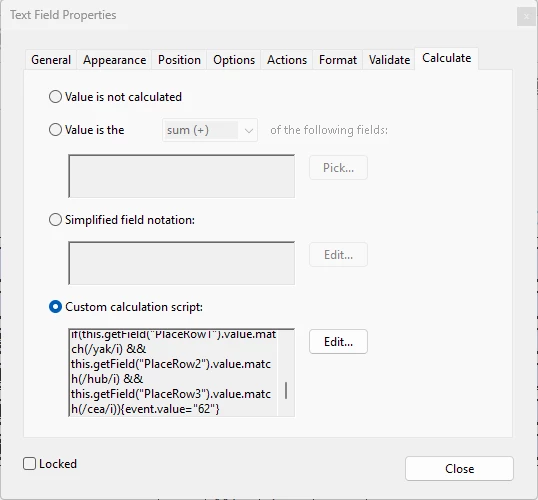 if(this.getField("PlaceRow19").value.match(/yak/i) && this.getField("PlaceRow20").value.match(/hub/i) && this.getField("PlaceRow21").value.match(/cea/i)){event.value="62"}