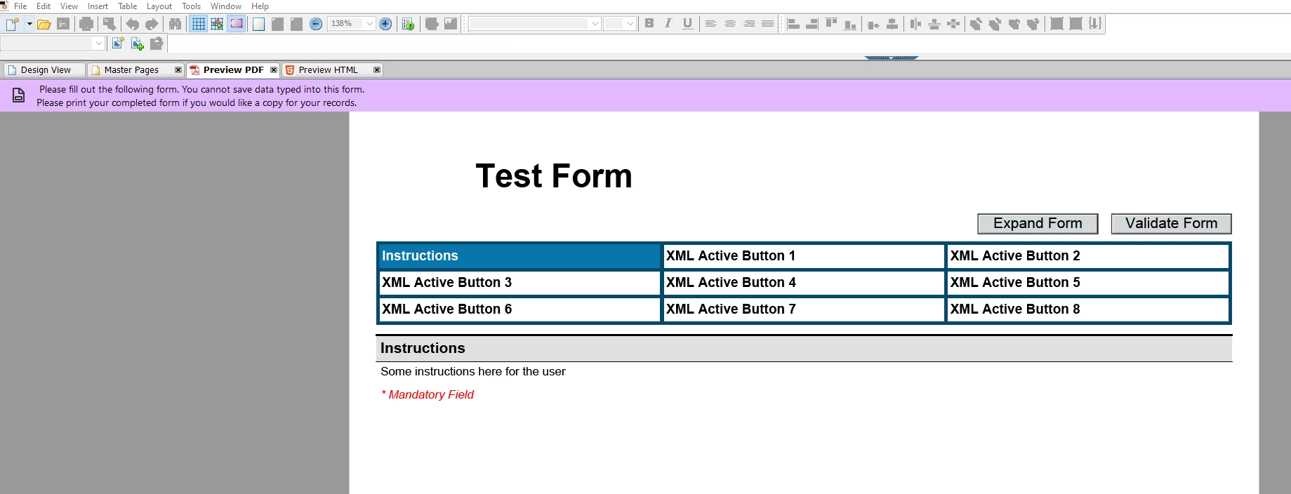 Newbie here. Here's my delima. I frankensteined a form to read the form title and its active buttons from an xml file. This works no issues when viewed on AEM Designer Preview. All buttons are working. But when i view this in Adobe Acrobat or Acrobat Reader, none of the properties show (Form Title and buttons). Any suggestions to remedy the issue? TIA.