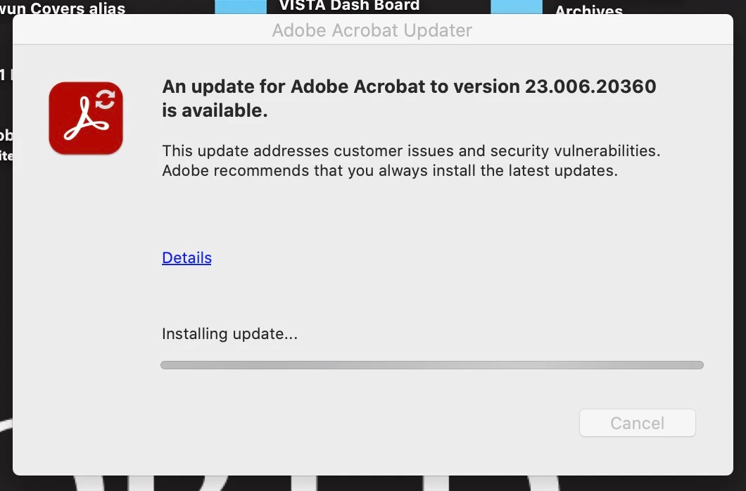 After updating, be sure to reboot your computer to complete the installation. For more detailed information about this new release, you can visit the following link: Adobe Acrobat Release Notes.