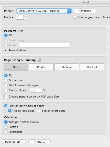 … I tried two other ways of printing a PDF on a MAC without using Adobe:  Opening the PDF with Chrome or with Safari; and then using their print interface.  Both offered the same options as Acrobat, but with fewer keystrokes (Safari was the best). …