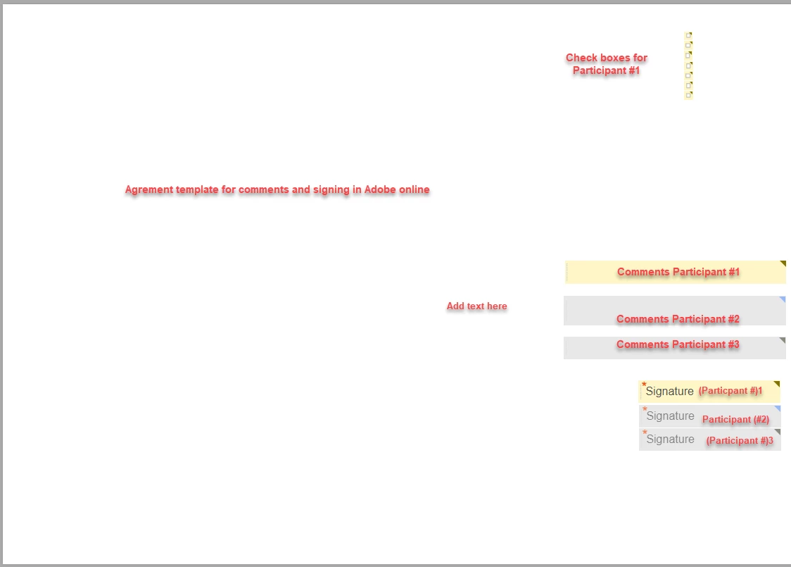 - The PDF from the minng CAD softare has to be sent out to 3 departments for comment and signature. So I set up a template in Adobe online under my account, that just has 7 checks assignied to participant #1, 3 comments sections assigned to all 3 participants then 3 signatures assigned to all 3 partiipants