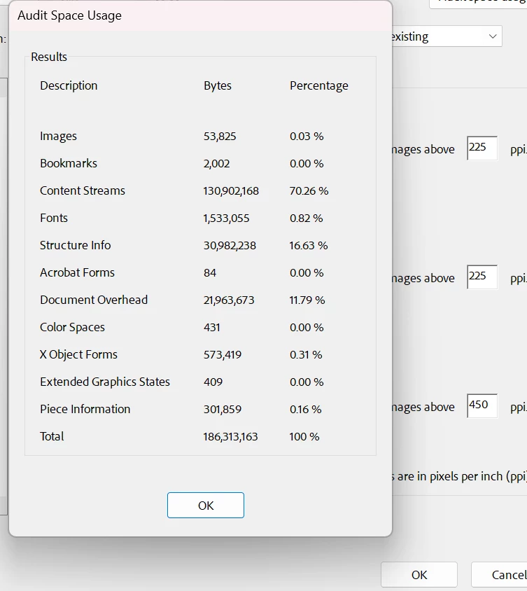 I am working on compressing a PDF and I found the area that shows me the Audit Space Usage and the percentages of each. I am looking for more information about what each category is and if there is overlap between them. This is to help me know which areas of the PDF I can work to reduce size in.