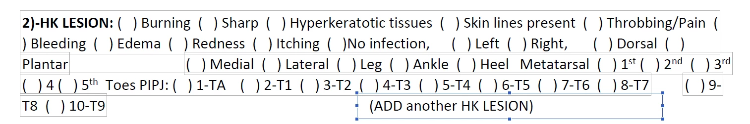 Below is an example the "(ADD another HK LESION)" is where the button would go to add another section. I understand it may not be as simple because we're trying to add text fields and checkboxes and then they have to be moved up and down and placed accordingly to their appropriate position. Kinda seems like Javascript will be involved if so I just need a sense of directions of how to do it in Adobe. If it's possible I would like some help or even other alternative ideas that may work.