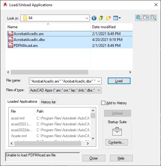 In previous versions of AutoCAD we were able to manually "APPLOAD" the AcrobatAcadIc.arx, AcrobatAcadIc.dbx and PDFMAcad.arx into AutoCAD based products such as AutoCAD Electrical 2020, which I am currently running. I've been asked to evalute AutoCAD Electrical 2022 to weed out any variations in day to day funtion so that we can get our design group software upgraded to the current software version as soon as possible. In the initial settup I attempted to run the APPLOAD command and add the files from C:\Program Files (x86)\Adobe\Acrobat DC\PDFMaker\AutoCAD\2019\64 which currently works in AutoCAD 2020 and adds Adobe PDF, Acrobat Markups Menus and an Acrobat tab to our Ribbon. I've attached a picture of the menu dropdowns and ribbon tab.