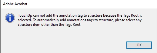 Touchup cannot add the annotation tag to the structure because the Tag Root is selected.