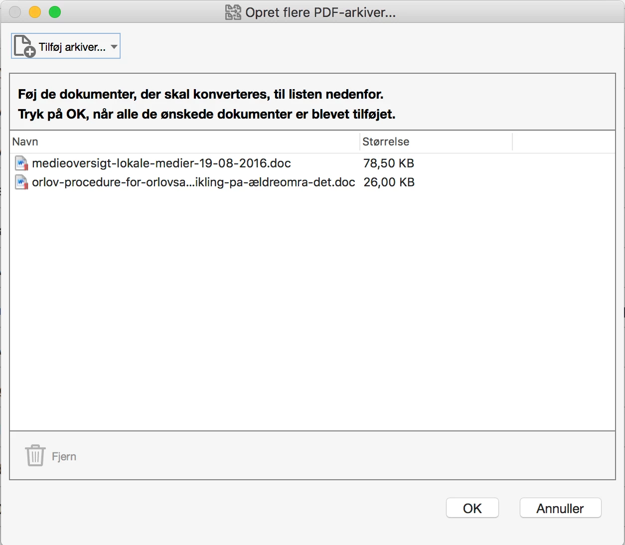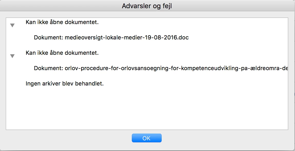 Apologies for the language being in Danish. Roughly it says that Acrobat Pro cannot open the documents and that no archives were processed.