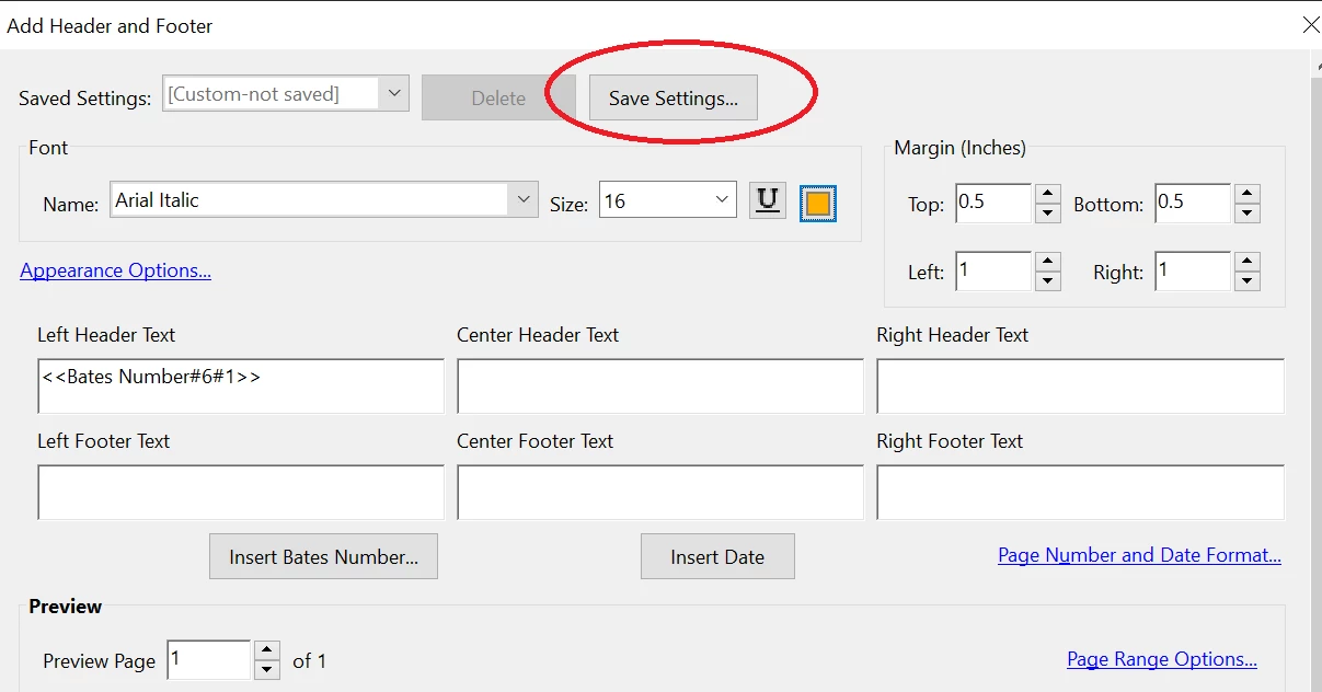 I'm wondering if there is a way to save settings. For eample when I insert bates numbering, i like to have it display on right with 15 font etc. is there a way to save such a setting so that i don't have to recreate the settings each time i go to add numbering to a new file?