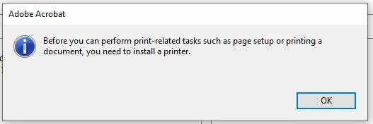 When attempting to print PDFs with Adobe Acrobat, I receive this error message: "Before you can perform print-related tasks such as page setup or printing a document, you need to install a printer."