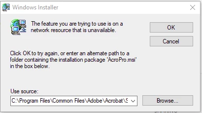 I located the file acropro.msi manually. It ran successfully, but I still have the issues.