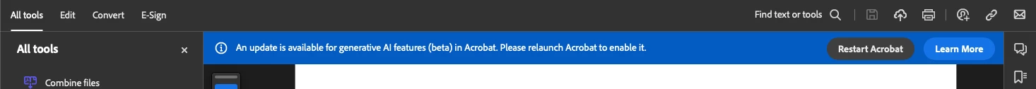 Now there is constantly this blue banner prompting me to update for an AI beta. There is no way to dismiss this bar, and when I click the Restart Acrobat button, Acrobat crashes every time. Any suggestions on what I can do, or is "New" Acrobat really this janky? I just need the blue banner GONE.