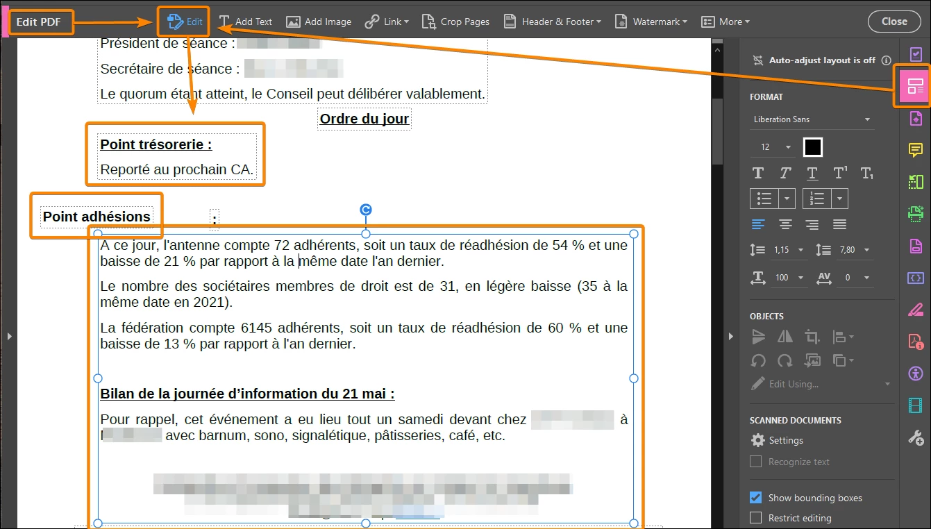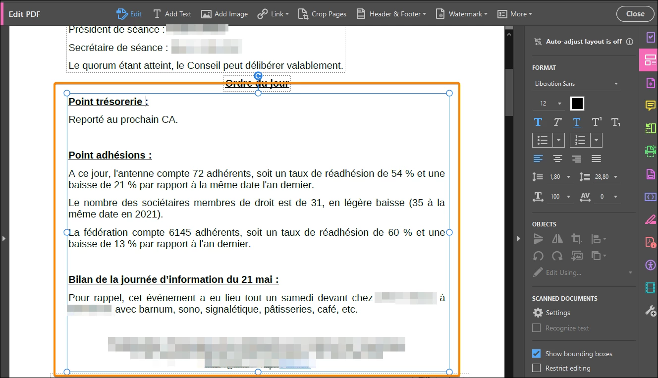 for the love of God, can you please give the ability to change bounding boxes??? Your (very expensive) program is not smart enough to arbitrarily "group related text". Seems every single document I need to edit, the bounding boxes encompass more than they should and make editing *impossible* and INFURIATING. Text inside the boxes doubles (same text overlapping itself), when I try to edit one word it changes everything else in the box (changes spacing and formatting), etc. If I can change the bounding box to encompass less then I can at least try to edit and or fix/correct the one word or sentance without having all of the other text get jacked up.