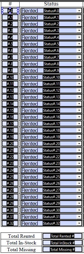 I'm doing inventary of some items and I'm trying to count each Rented, Instock, Missing item and place it in their respective Total boxes. Each status box is a dropdown menu with the following options: