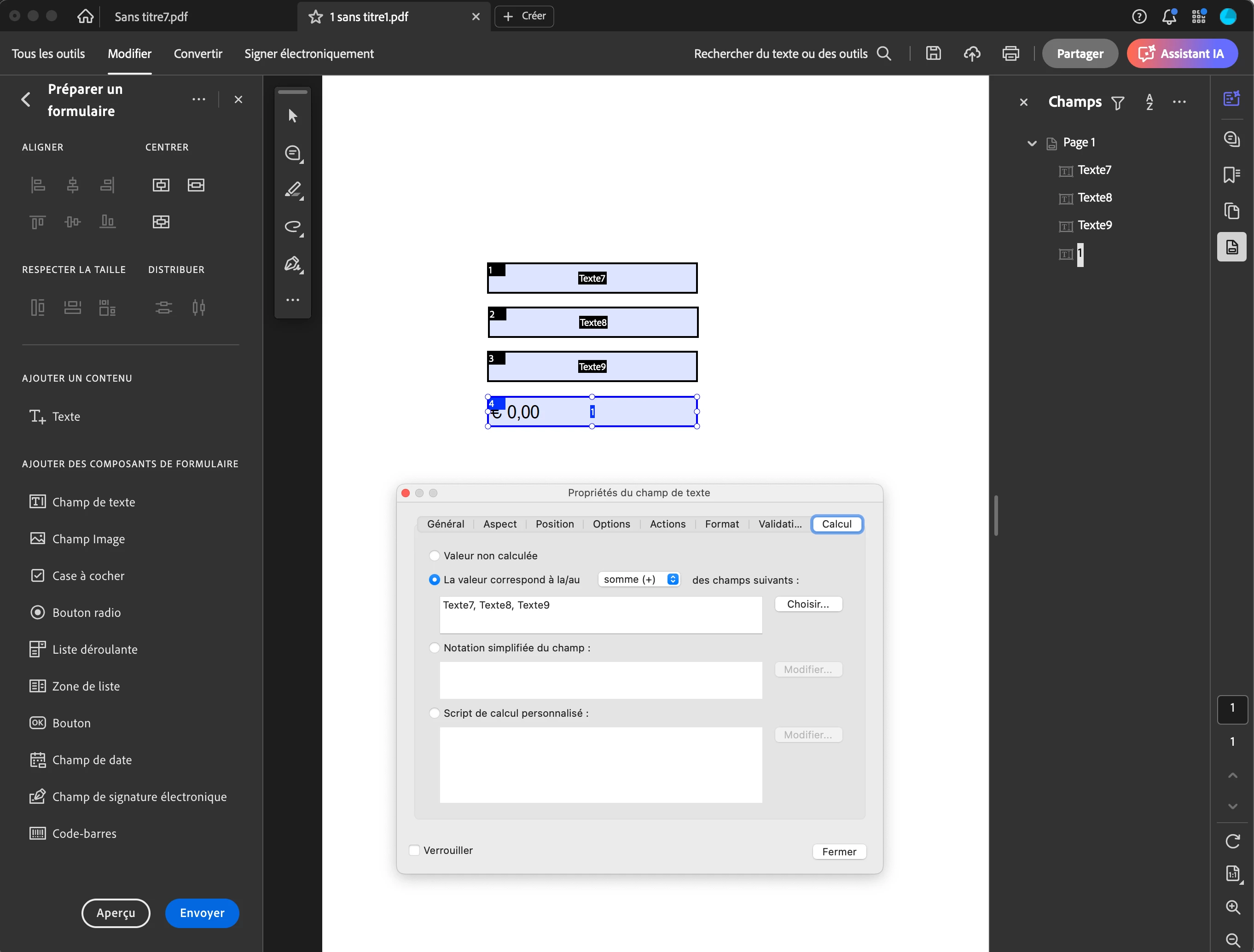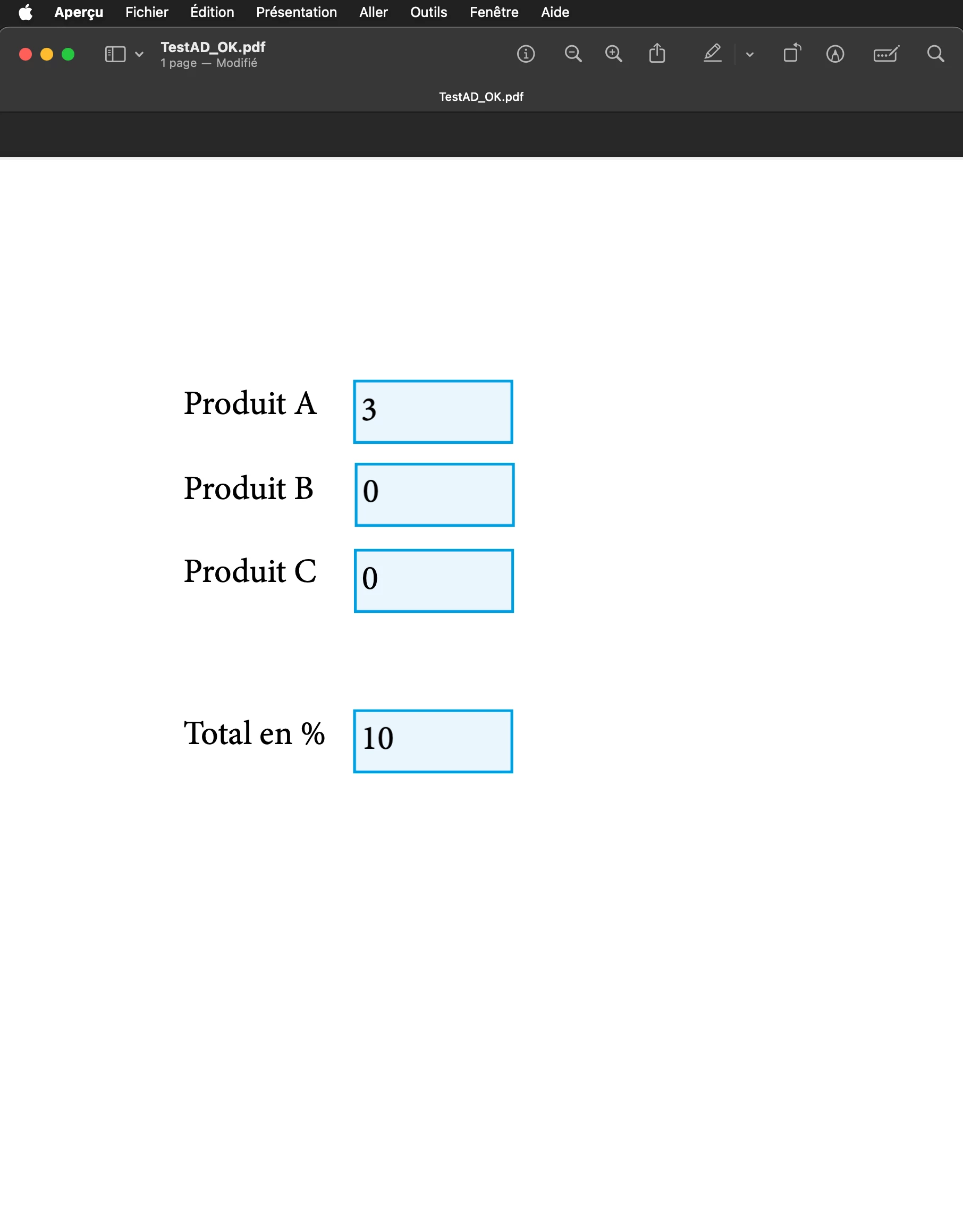 I created with adobe acrobat a document with the automatic calculation of a sum of 3 fields in a 4th field.
