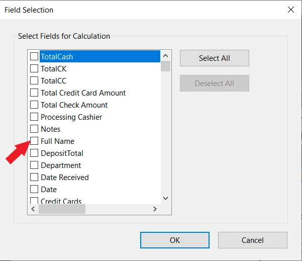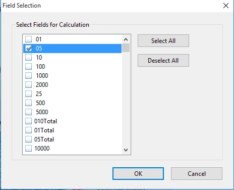 I have developed a deposit form and I'm trying to enter calculations to make it SUPER simple to fill out, but when I go to "pick" the fields for the calculations, I only get the options to select or deselect ALL (rather than picking individual fields).