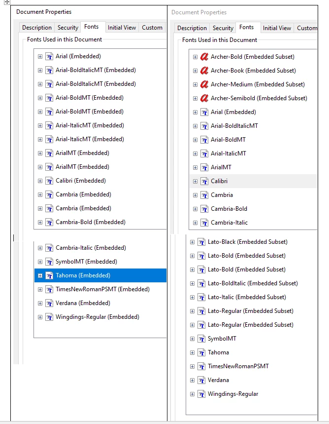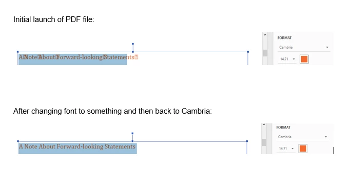 I have a document that was converted to PDF from an online platform we use for document management. The PDF generated has multiple fonts being used. For some reason, the headers display like gibberish. They're using Cambria as a font. When I click on the tool Edit PDF and highlight the gibberish, I noticed that it reports the line as Cambria. If I change the font to something else, the text corrects itself and displays properly. I can then change it back to Cambria and it displays properly at that point. I'm not sure why on initial launch of the file all the text set to Cambria displays gibberish until I manually change it to something and then back again. Is there a way to reapply the fonts throughout the whole document so I don't have to manually search for all the gibberish lines one at a time?