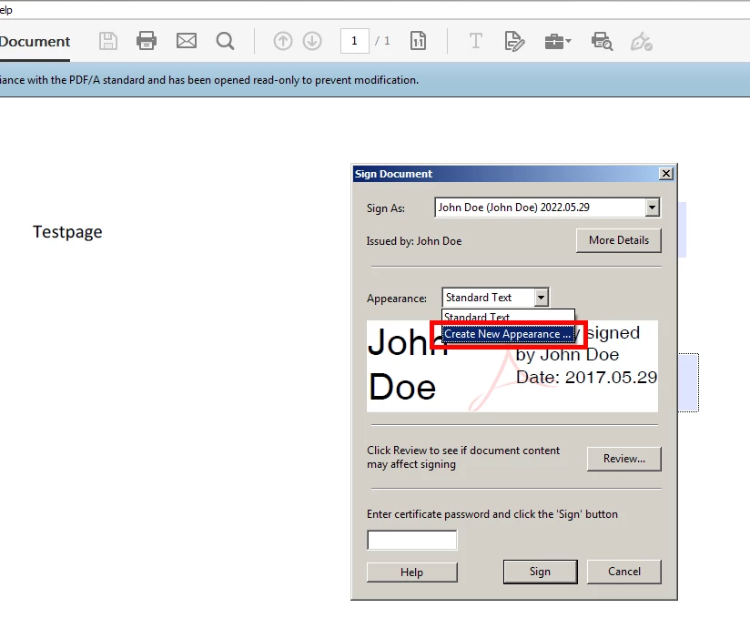 1. In the signing dialog use the option "Create new Appearance"