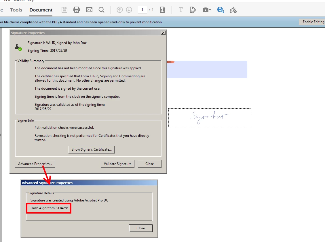 What I'm interested in is whether Acrobat can create a PDF/A 1b document with a SHA256 signature.