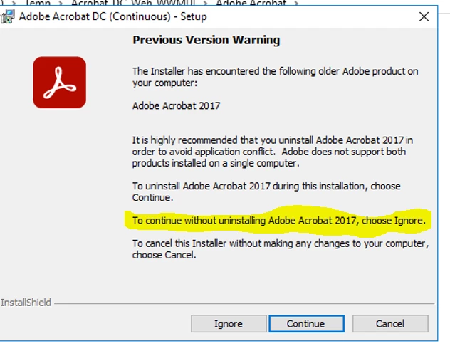 What will happen if we choose Ignore? do you think it will continue to install the Adobe Acrobat DC and it will not affect the current installed Adobe Acrobat 2017 functionality?