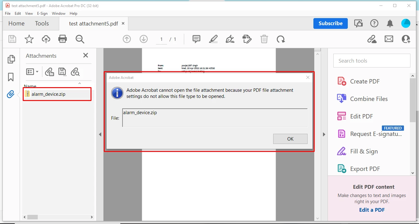 when i try to open our attachment file which have in .zip format a pop -up message should get. your pdf attachment setting doesn't allow to open this file.
