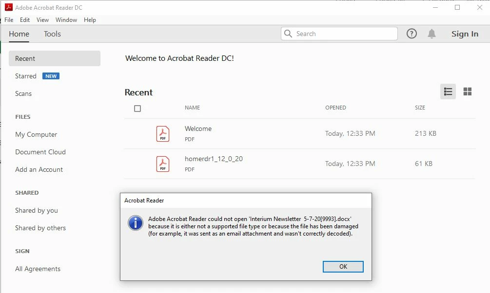 Ever since I upgraded from Windows 7 to Windows 10 I am not able to open any PDF files. I switched to Adobe acrobat DC and I still get an error code saying that the file can not be opened for it does not support it or the file is damaged. I get this from EVERY e-mail sender who sends me a PDF so I know there is nothing wrong with the PDF's the people are sending me. I checked for upgrades on Dc and nothing there. I turned off the security protocal in the sandbox and that did nothing. Below is what I see when I try to open a PDF file. Any help?