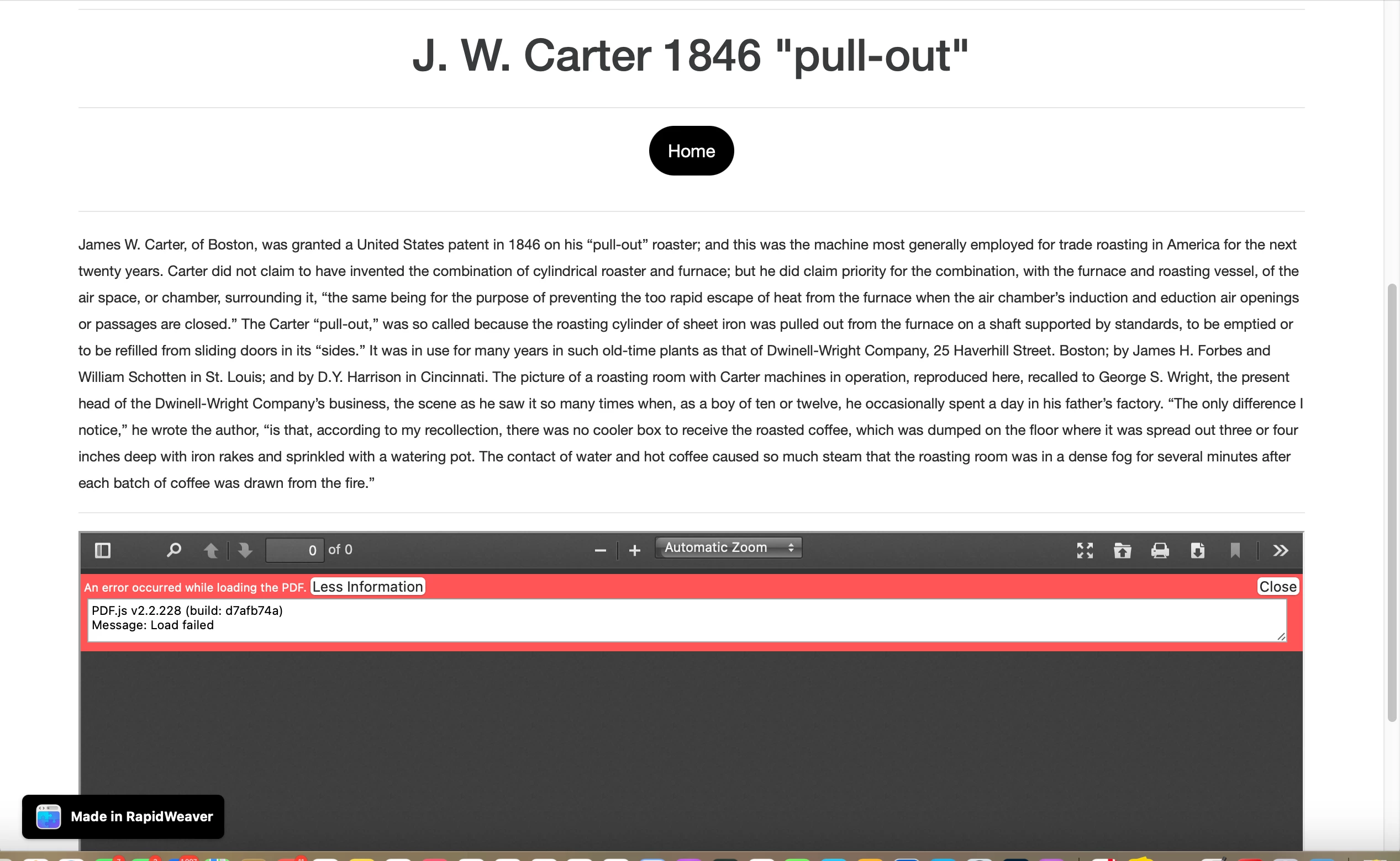 building a web site on my MacBook Pro. The native .pdf viewer has a lot of problems on all my Mac devices, iPhone, iPad Pro and my MacBook Pro. I have hundreds of .pdf's on my site. It is an informational site that covers 19th Century U. S. patent coffee roasters made between 1840 and 1900. Believe it or not over 200 coffee roasters were patented. Can I link internal patents to be displayed on my site? This is the error message that I get, PDF.js v2.2.228 (build: d7afb74a) Message: Load failed.