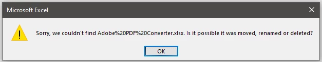 I can no longer convert an excel file into a pdf using Acrobat DC. I use the program to combine two files, a word document, and an xlsx sheet, into one PDF. Converting the word document works just fine, but then the program force quits when attempting the excel sheet. I then get this message on the excel sheet: