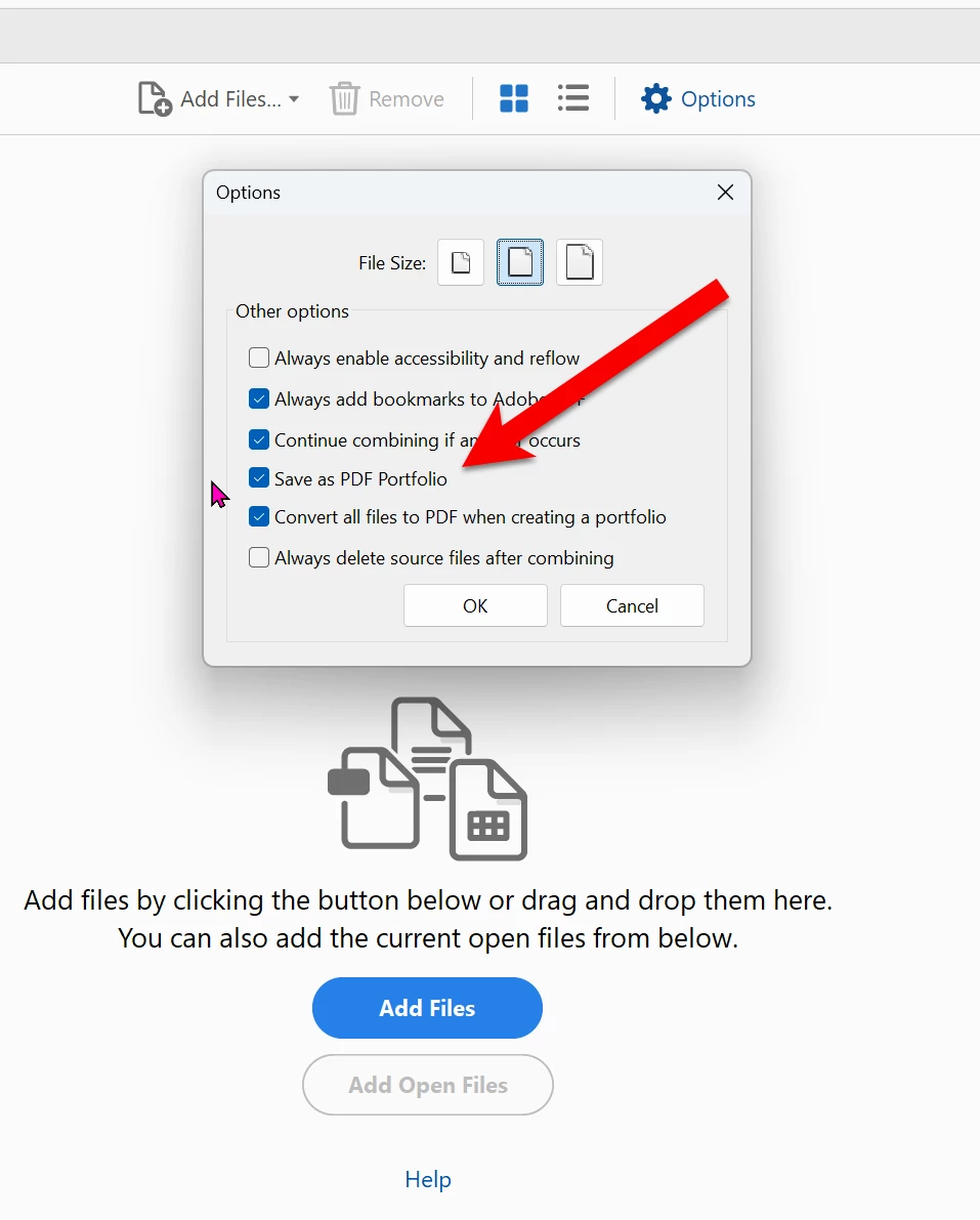 If iI go to Options and I turn that off, then I can no longer click Combine Files in the top right, it grays out