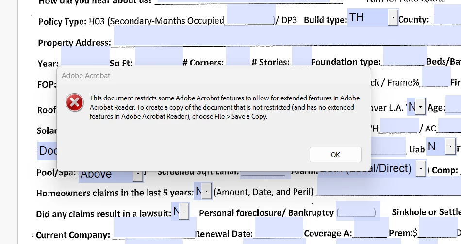 I am trying to edit an interactive Adobe form I created and keep receiving the following error message: