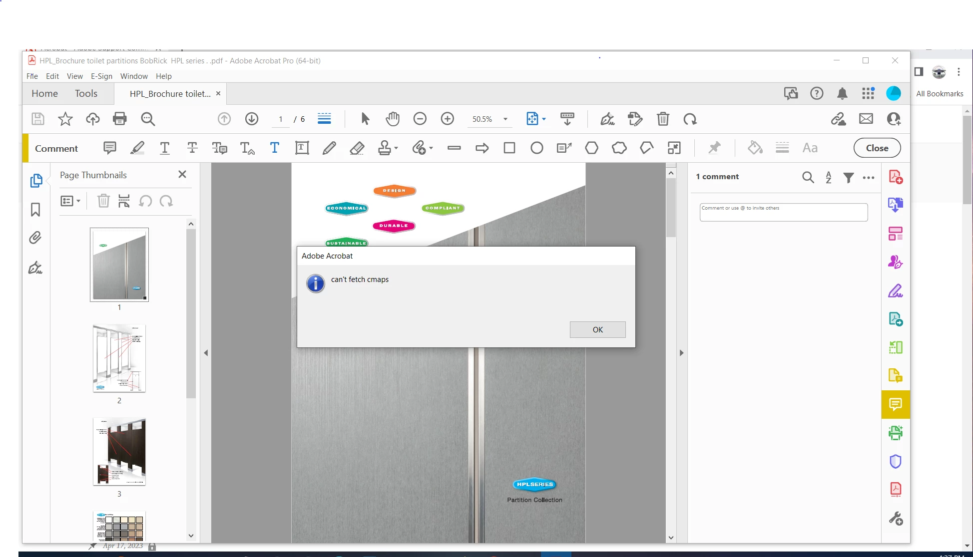 Every time I try to add a comment by selecting the the "Comment" toolbar and clicking the "T" to add text, and then clicking in an area I wish to insert text, I get the error "Can't Fetch cmaps" as soon as I begin to type. What could be causing this issue?