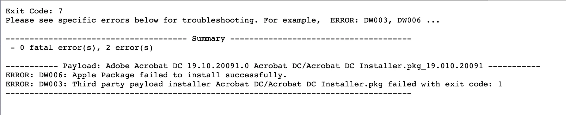 ERROR: DW003: Third party payload installer Acrobat DC/Acrobat DC Installer.pkg failed with exit code: 1