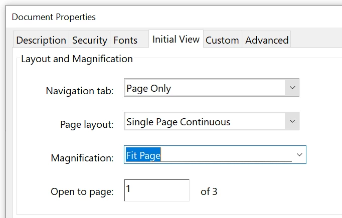 I'm using Adobe Pro DC. My PDF documents must be saved so the bookmarks are displayed when it's opened. Can the document properties by set to default to these settings so I don't have to set them each time? => file properties | initial view | navigation tab (bookmark/panel&page) | page layout (single page continuous) | magnification (fit width) | open to page 1