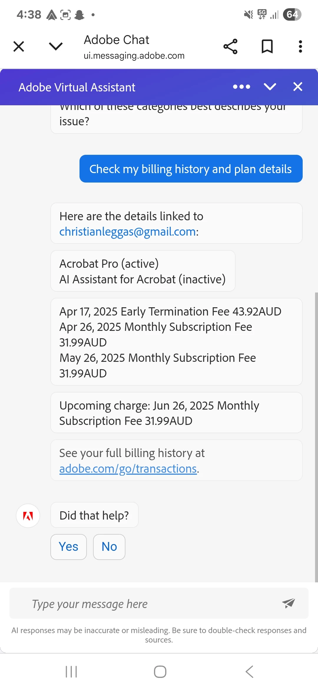 Upon reviewing your account, we can confirm that you previously had an AI Assistant for Acrobat subscription, which was canceled on April 17. As part of that cancellation, an early termination fee (ETF) was applied, as the cancellation occurred outside the initial 14-day window.