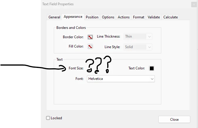 When I check the Properties>Appearance window within Adobe acrobat pro it doesnt present the opportunity to change the font size, only the option to change the font.