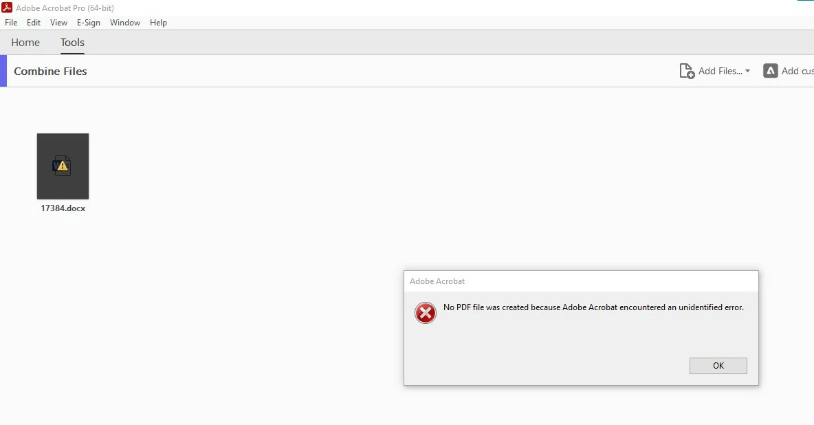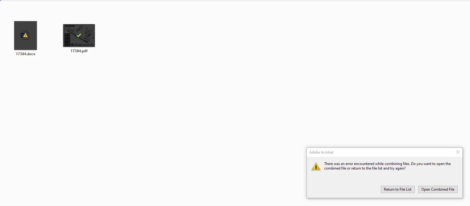 I am trying to combine a multi page word document (.docx) and a single page pfd file however the task fails to complete and i am getting a windown saying " There was an error encountered while combining files...". This is very frustrating as i am paying for an Adobe membership and the basic functions are NOT working. Any assitance would be much apprecaited.